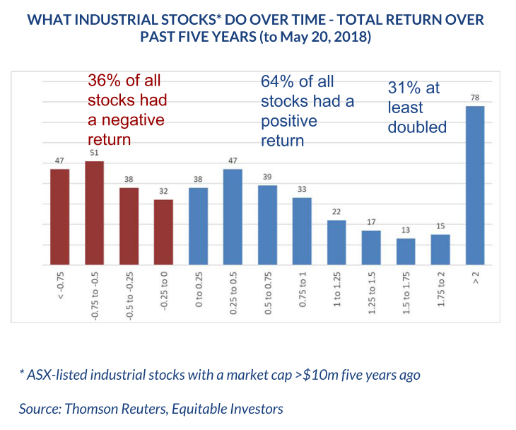 Industrial stocks, within their broader definition (ie stocks that aren't miners or explorers), are what the Equitable Investors Dragonfly Fund is focused on. We ran some numbers for a presentation on the Fund and pulled together the following two charts on the historical performance of ASX industrials.