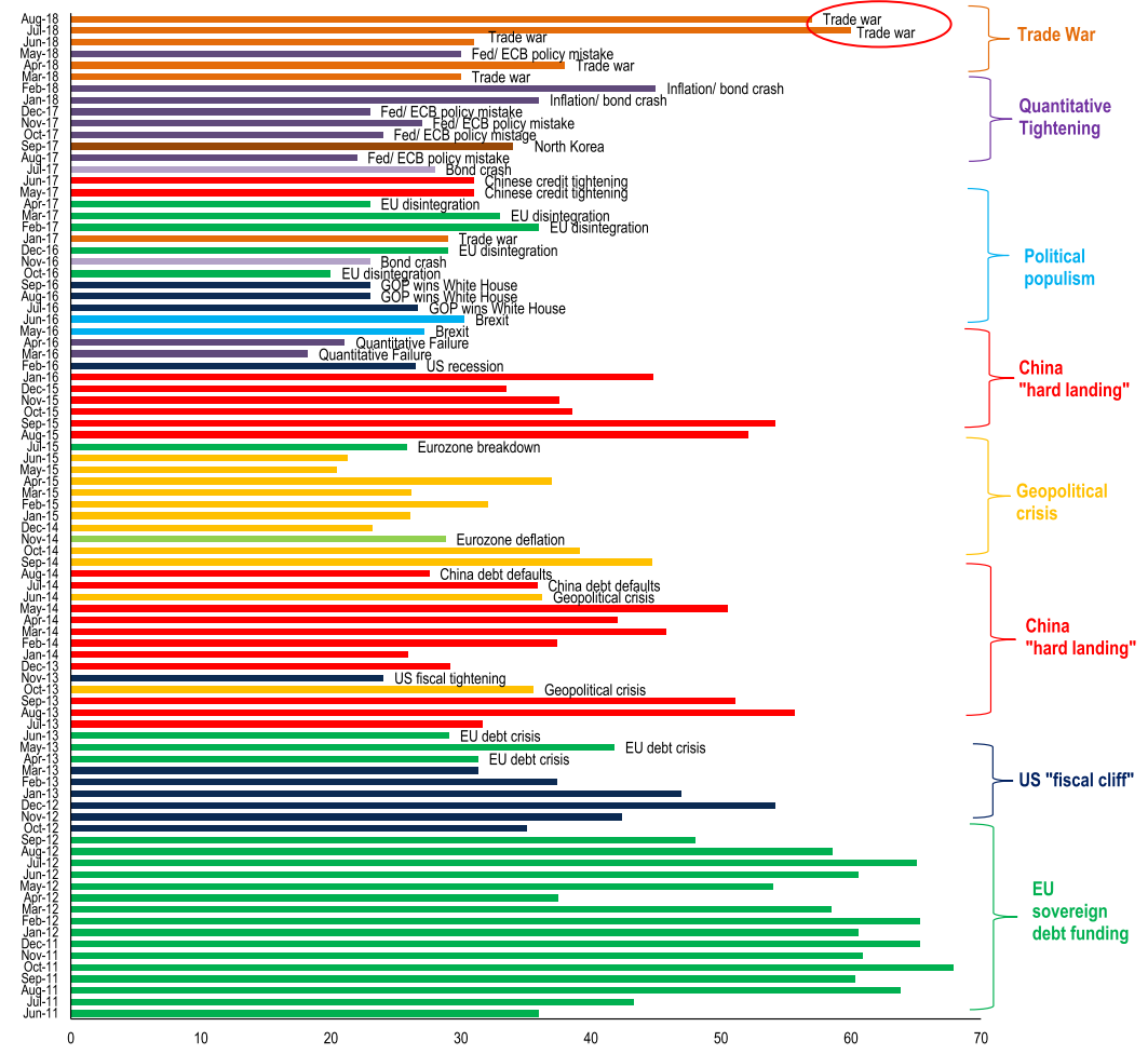 B of A Merrill Lynch Fund Manager Survey finds "Trade War" considered "biggest tail risk" in recent months