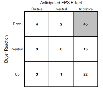 Credit Suisse took a sample of 95 of the M&A deals, categorised them based on whether the company said it would be immediately accretive or dilutive to EPS, then reviewed the one-day abnormal return for the buyer on the day of the announcement .